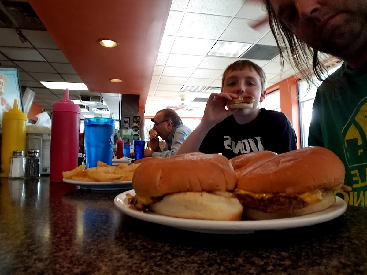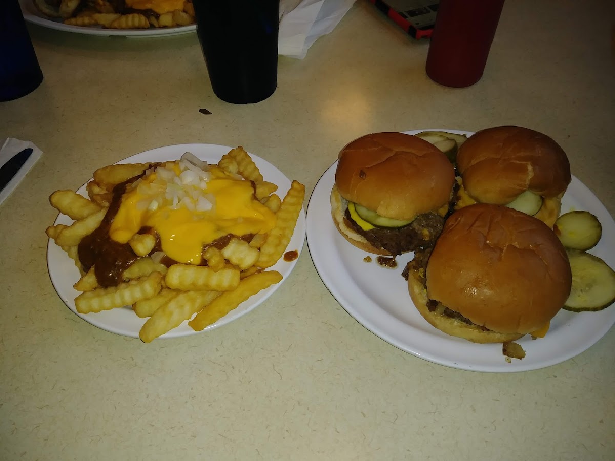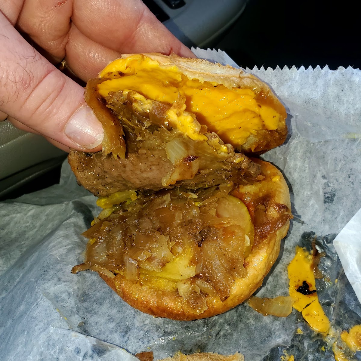 This is an old-school, nostalgic burgers and fries kind of place. They have a counter with round stools, and the booths and decorations create a very retro atmosphere. The food was good, burgers are sliders and were delicious, you can get whatever toppings you prefer, and your food is made fresh for you. You will probably need two or three for a meal. Fries are crinkle cut and were served too hot to eat. If you remember the donkey that used to be on their sign, it is now indoors in It's own glass closet, which you can enter to photograph. Parking in adjacent lot, or there is a drive thru.